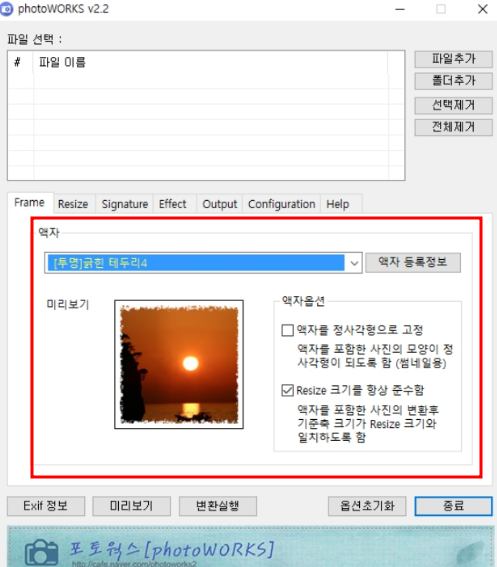 여기에서 사진 톤이나 색상 밝기 등을 조금 변환시켜주시거나, 포토웍스에서는 액자를 입힐 수 있기 때문에 사진에 액자를 입혀서 사진을 조금만 변환시켜주시면 됩니다.