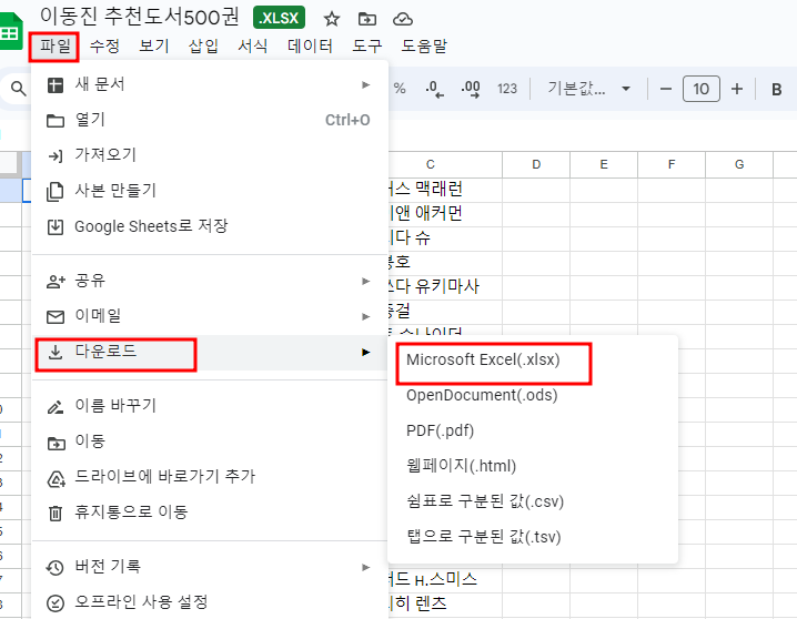 링크로 들어가신 뒤 파일-다운로드-Excel을 눌러서 PC로 받아주시면 되겠습니다.